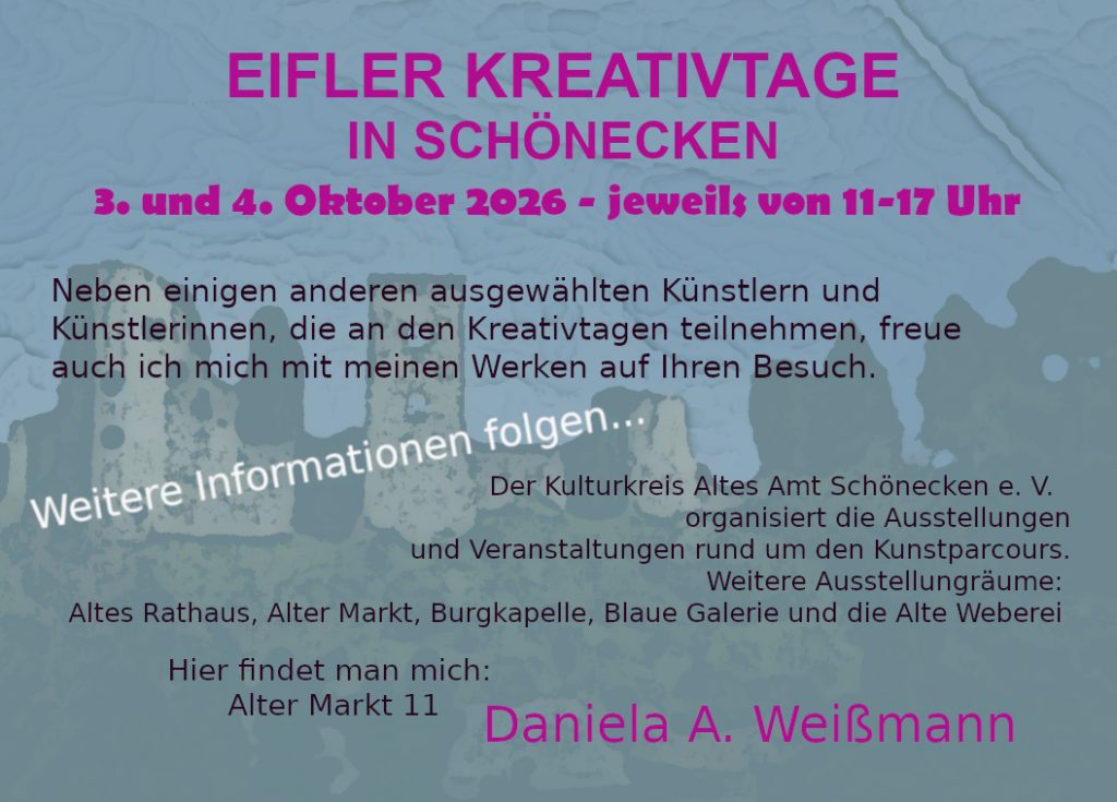 Meine Bildinhalte sind von KI völlig unbeeinflusst, was auch so bleiben soll. Ich kümmere mich in meinem Kleinunternehmen, das sich im Herzen der Eifel befindet, um alles selber, auch um diese Internetseite.